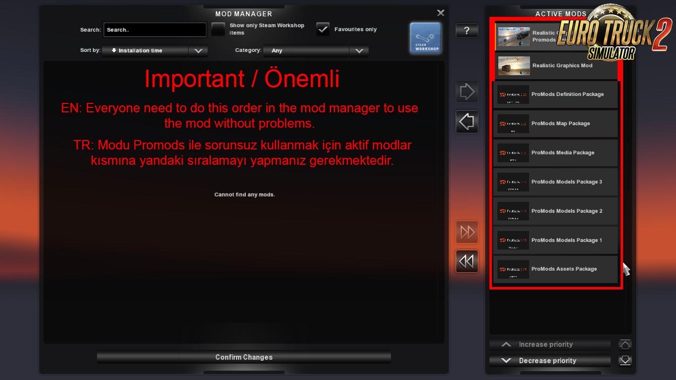 Required: Realistic Graphics Mod 2.3.x, Promods Version 2.31 and Ets2 1.32.x game version