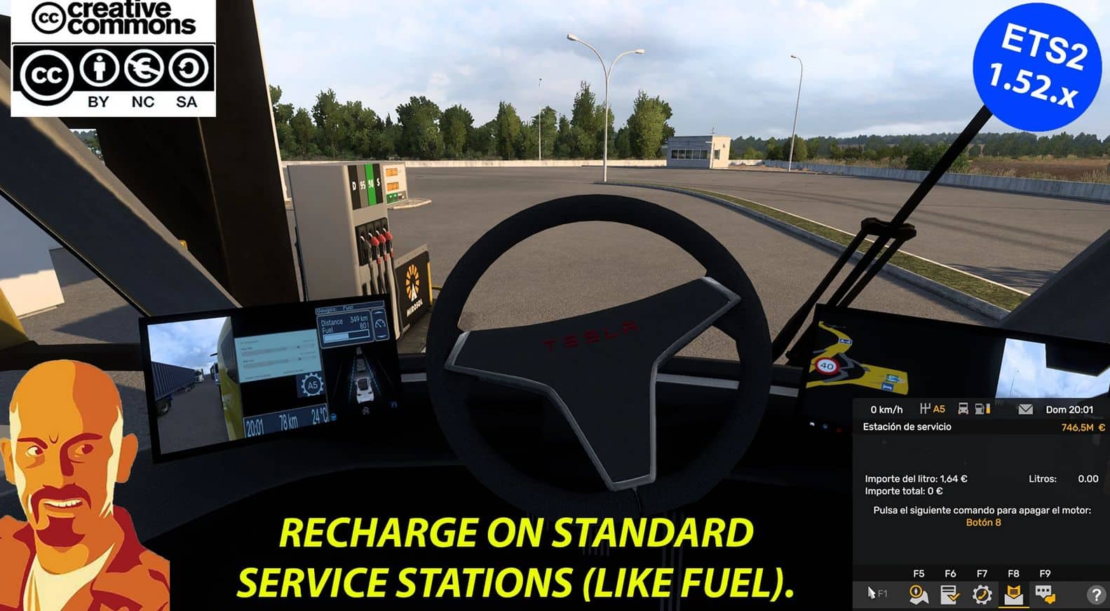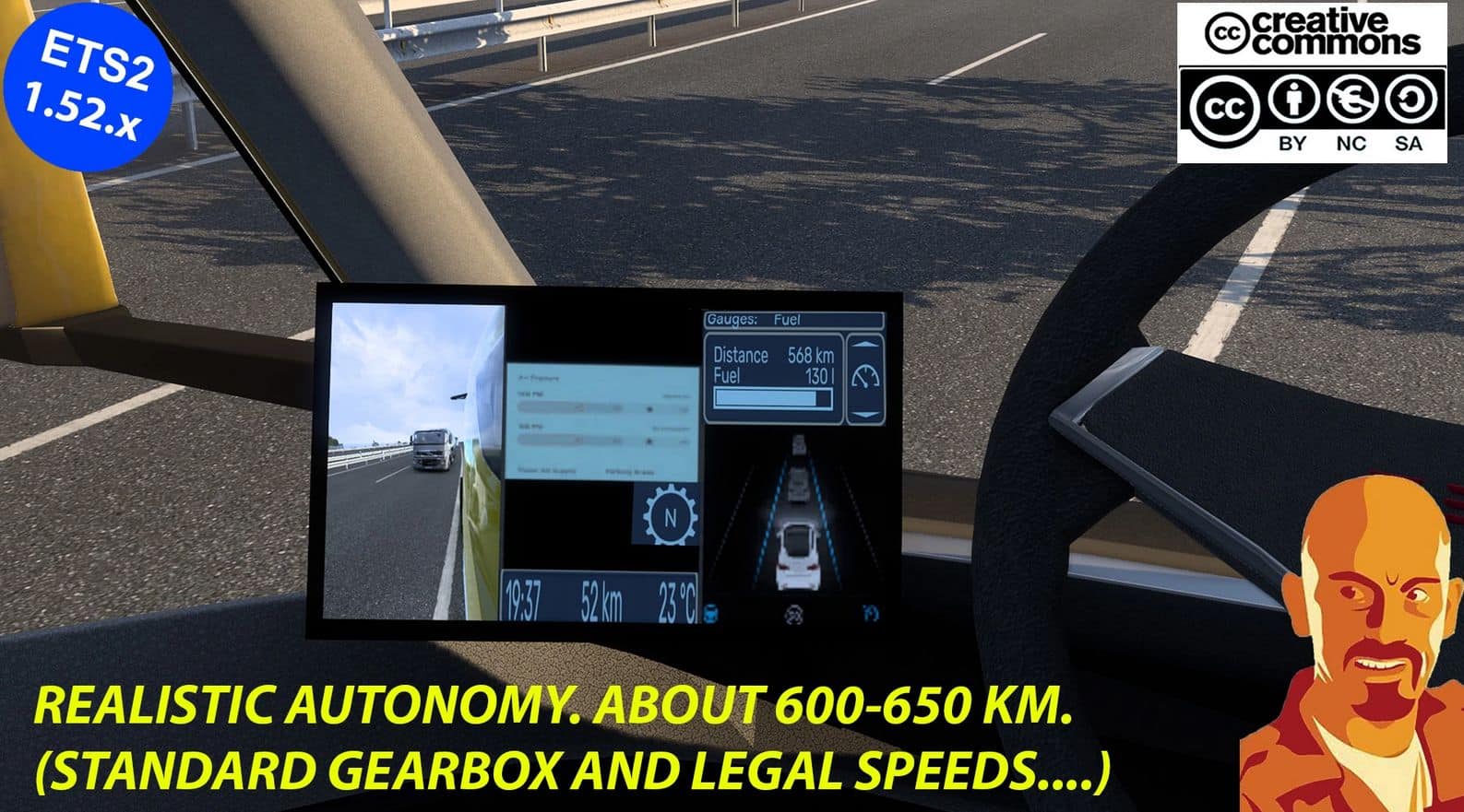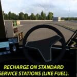 This mod allows the 2019 Tesla Semi truck to be recharged at normal gas stations and adjusts the actual range to around 600-650km under normal conditions, which are: legal speeds and standard gearbox.