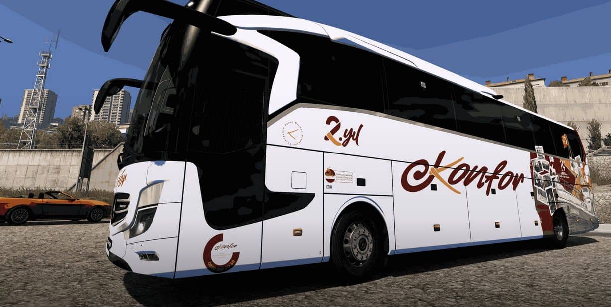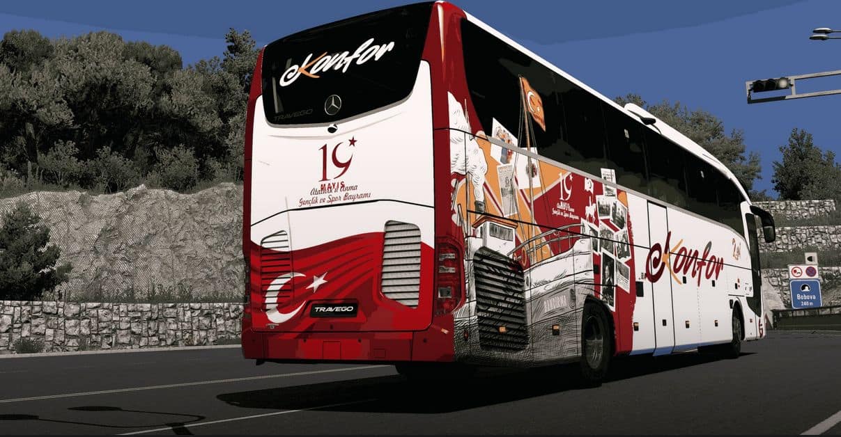 I am with Mercedes Benz Travego 16 SHD 2+1 2023 model Comfort Tourism Corporate Cover, which is one of the Heavy Vehicles Turkey mods. It appears in Custom Template-4. White Color is not recommended. You can join the Comfort Tourism family and become a Virtual Bus Driver. For all and more…