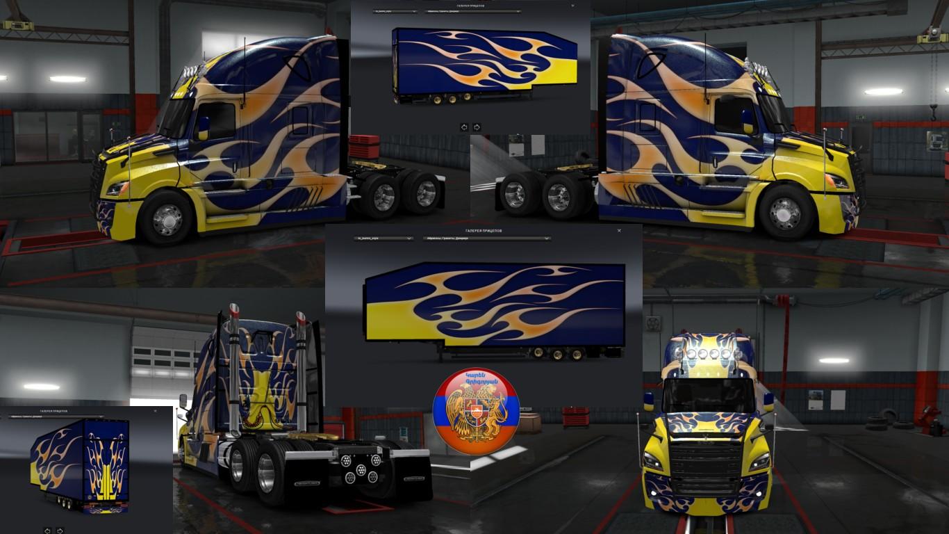 I offer you heed; combo skin pack Burnin for truck Freightliner Cascadia 2018. The skin is painted in metallic, in three different ottenkah.Trailer autonomous, registered in the traffic. in orders agencies and in the gallery. Load weight of 35 tons. To name goods, apricots, pomegranates and Jermuk mineral water.
