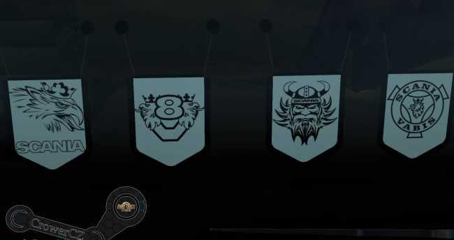 Scania Pack Pennants Interior Addon Mod working only with DLC Cabin Accessories! All Pennants Slot – Scania Vabis – Scania V8 – Scania Eagle – Scania Viking.