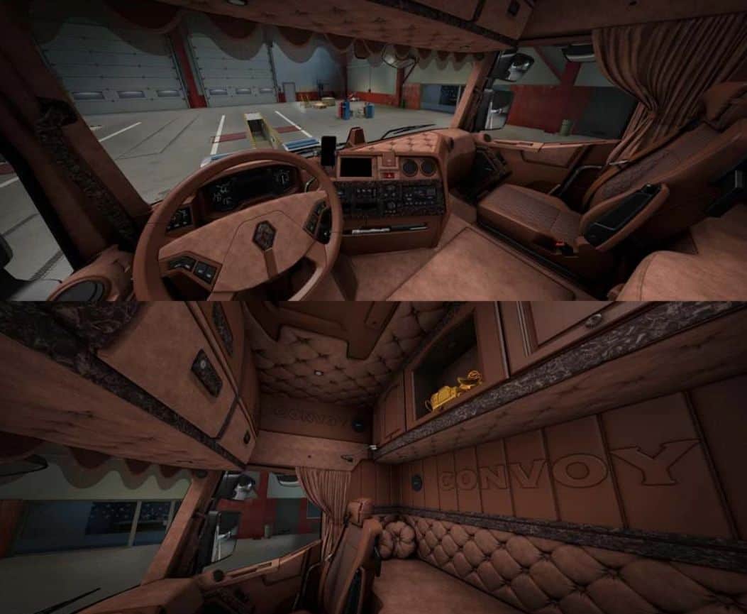 This modification adds a custom convoy interior for my Renault Range T Evolution. It is available in four colors and works with the high-sleeper and sleeper cabins.
