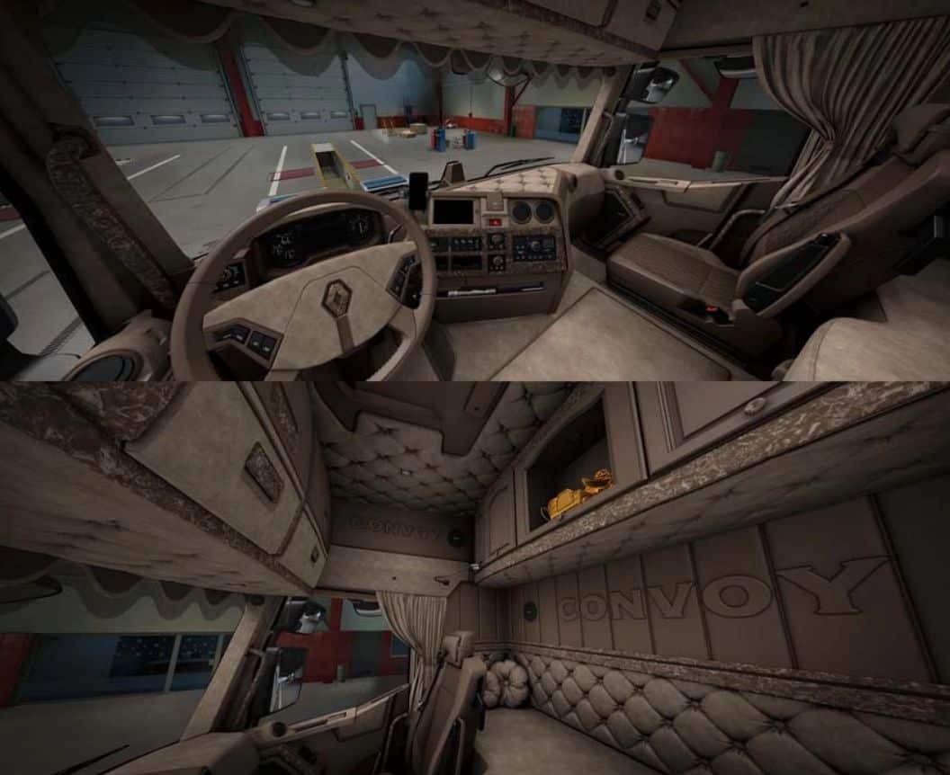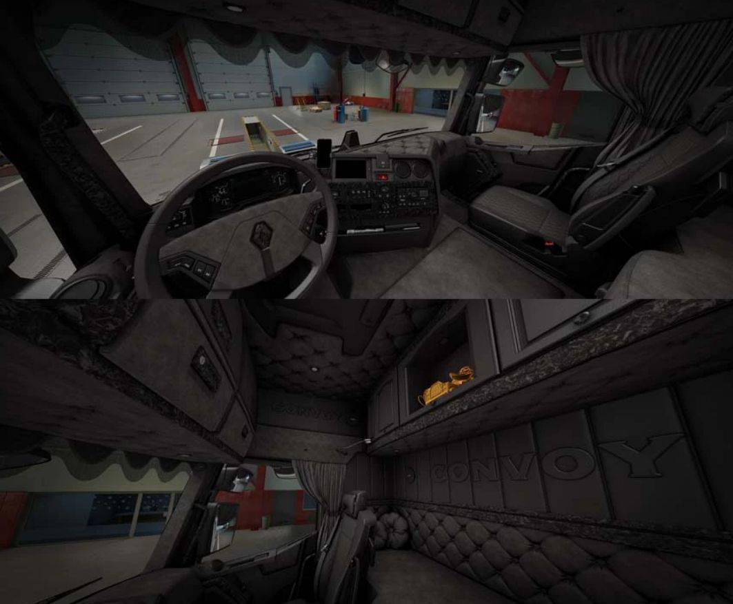 This modification adds a custom convoy interior for my Renault Range T Evolution. It is available in four colors and works with the high-sleeper and sleeper cabins.