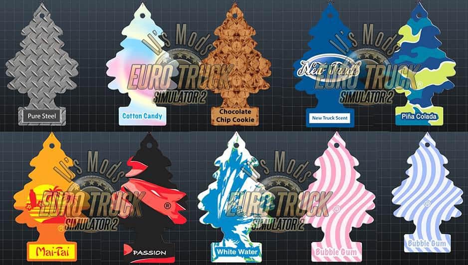 This mod includes a selection of Air Fresheners & hanging toys for all SCS trucks.