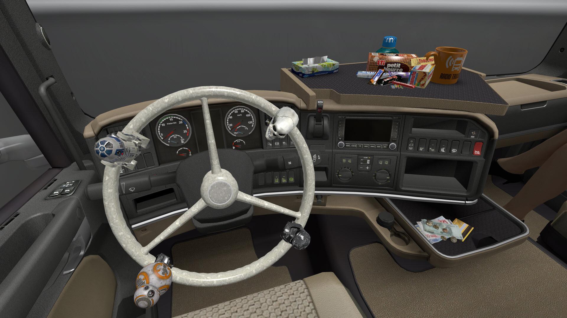 This mod contains over 400+ cabin accessory items suitable for your taste, bringing female and male co-drivers, bobbleheads, accessories for truck driver needs, snacks, electronic devices, computers and tablets, lots of scarves, fresheners, toys and many many more.