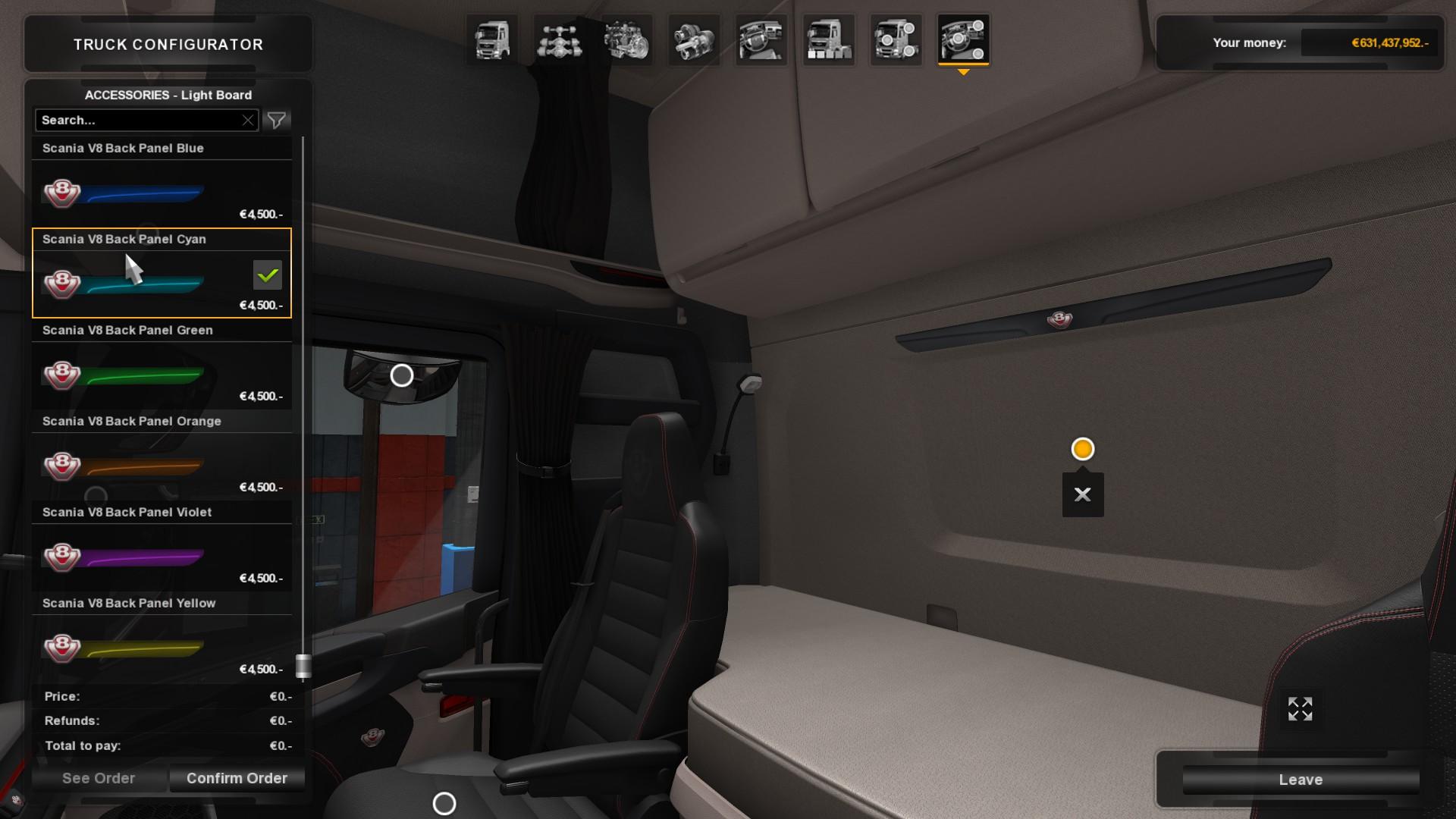 This mod adds few more variants of background lights colors to your new Scania S and R. It also add few different color variants of the v8 back panel. It is only compatible with the new SCS Scania (currently in open beta!).