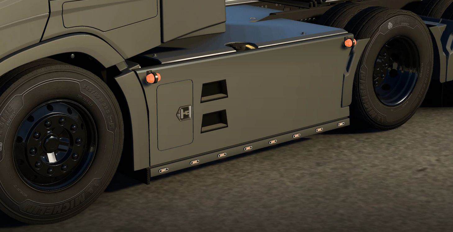 – All parts of the sideskirts are built from the scratch, except the locker handle model, which is borrowed from SCS trailers.