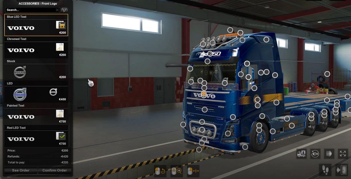 All Original Accessories + Headlights, Sideskirts, Fenders, Rear Bumpers, Middle Exhausts, LED and lights bar for side deflector, Small Lights, Text Logo, Angel Eyes Lights, Decal, Painted Bull Bar, Cam Mirror, Corner Eye and Decoration Lights for each of l2h3, l2h3_8x4 and l2h3 tandem cabine.