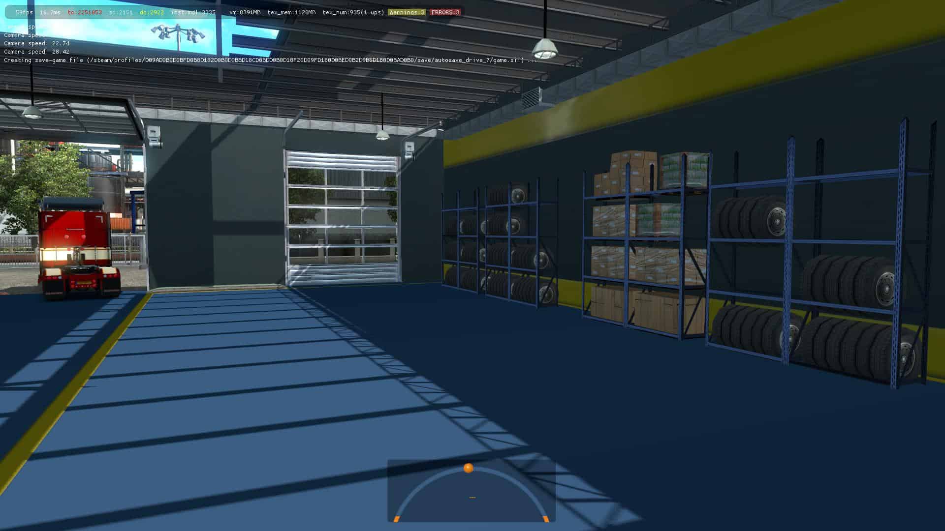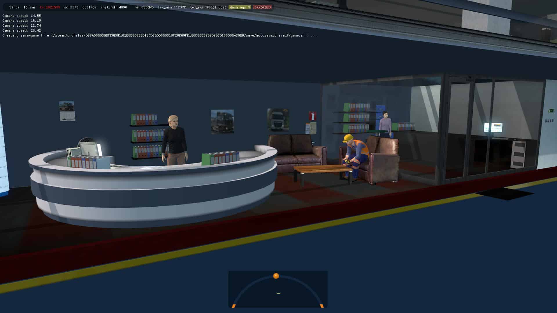 Inside the garage there are shelves with spare parts, a dispatcher’s office with an employee, workers, a minivan for the delivery of materials, a resting place, two racks with lifting equipment, etc.