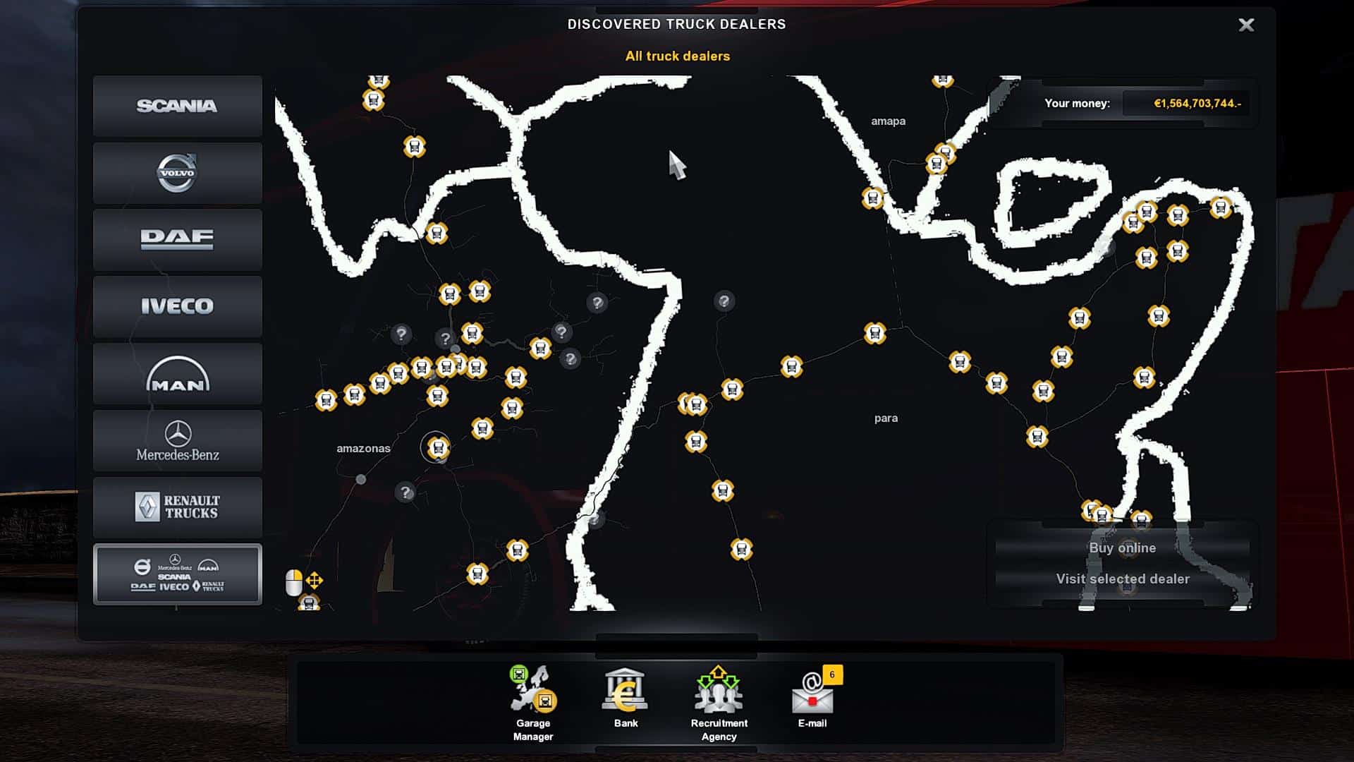 Save Game (Profile) For Mapa Norte Brasil 2.0 ETS2 1.34 (all cities,garages,truck dealer,money)