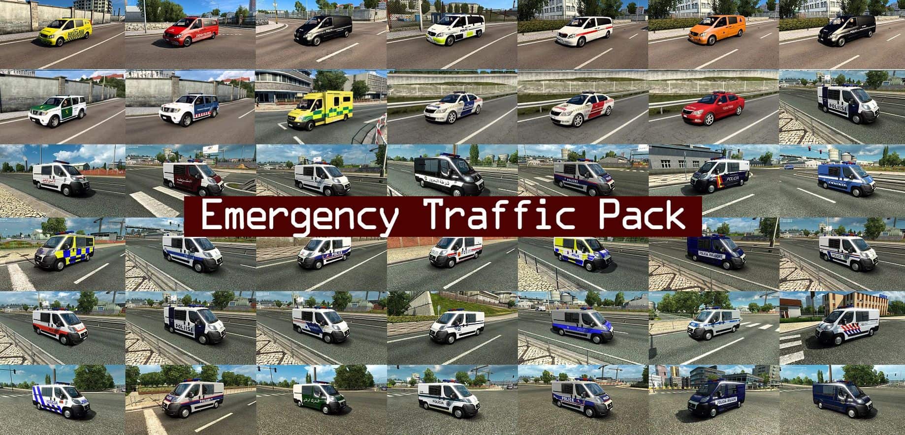 Mod adds to traffic emergency vehicles (Mercedes-Benz Vito, Fiat Ducato, Nissan Pathfinder, Skoda Octavia, Mercedes-Benz Sprinter) in 39 countries: Finland, Albania, Estonia, Russia, Slovakia, Austria, Slovenia, France, Germany, Moldova, Spain, Sweden, UK, Ukraine, Switzerland, Greece, Belgium, Bulgaria, Hungary, Iceland, Croatia, Czech Republic, Italy, Latvia, Netherlands, Norway, Denmark, Liechtenstein, Poland, Portugal, Romania, Lithuania, Luxembourg, Turkey, Tunisia, Algeria, Morocco, Libya, Egypt.