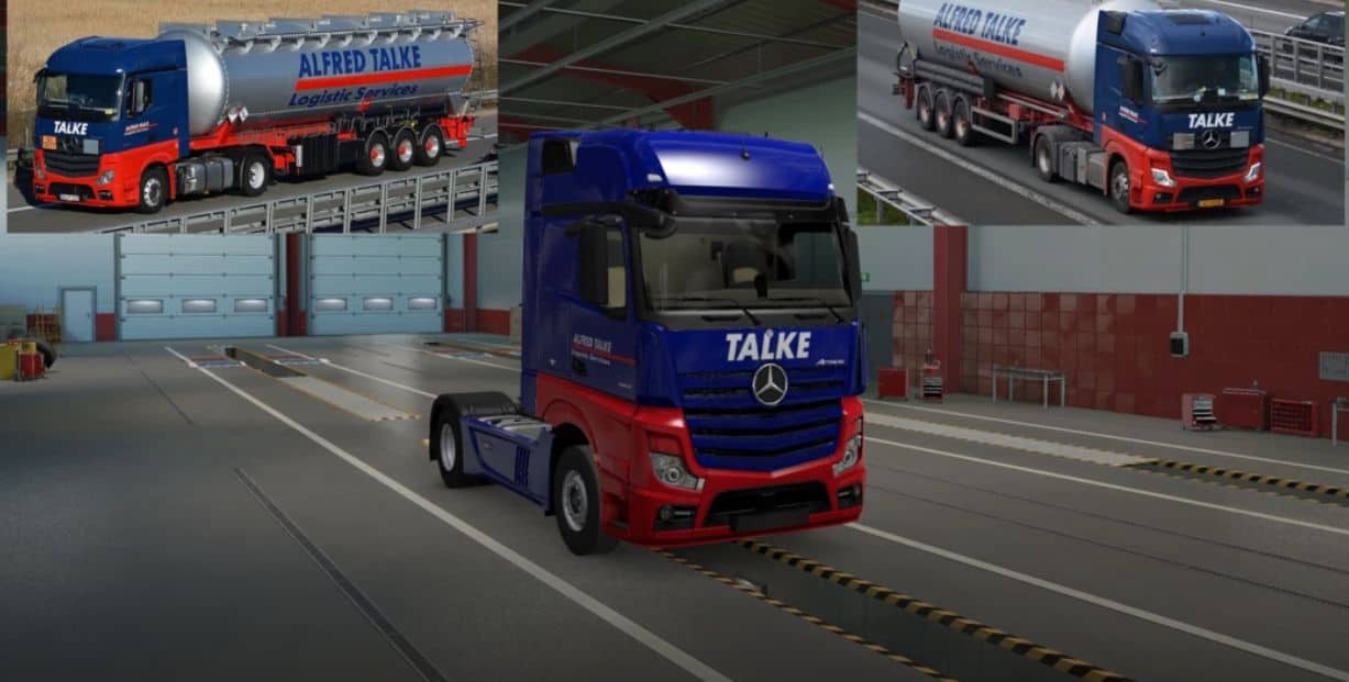 Alfred Talke Skin for Mercedes Benz New Actros. Available in all cabins except Gigaspace 8×4. Should work in all game versions (recent version is 1.49).