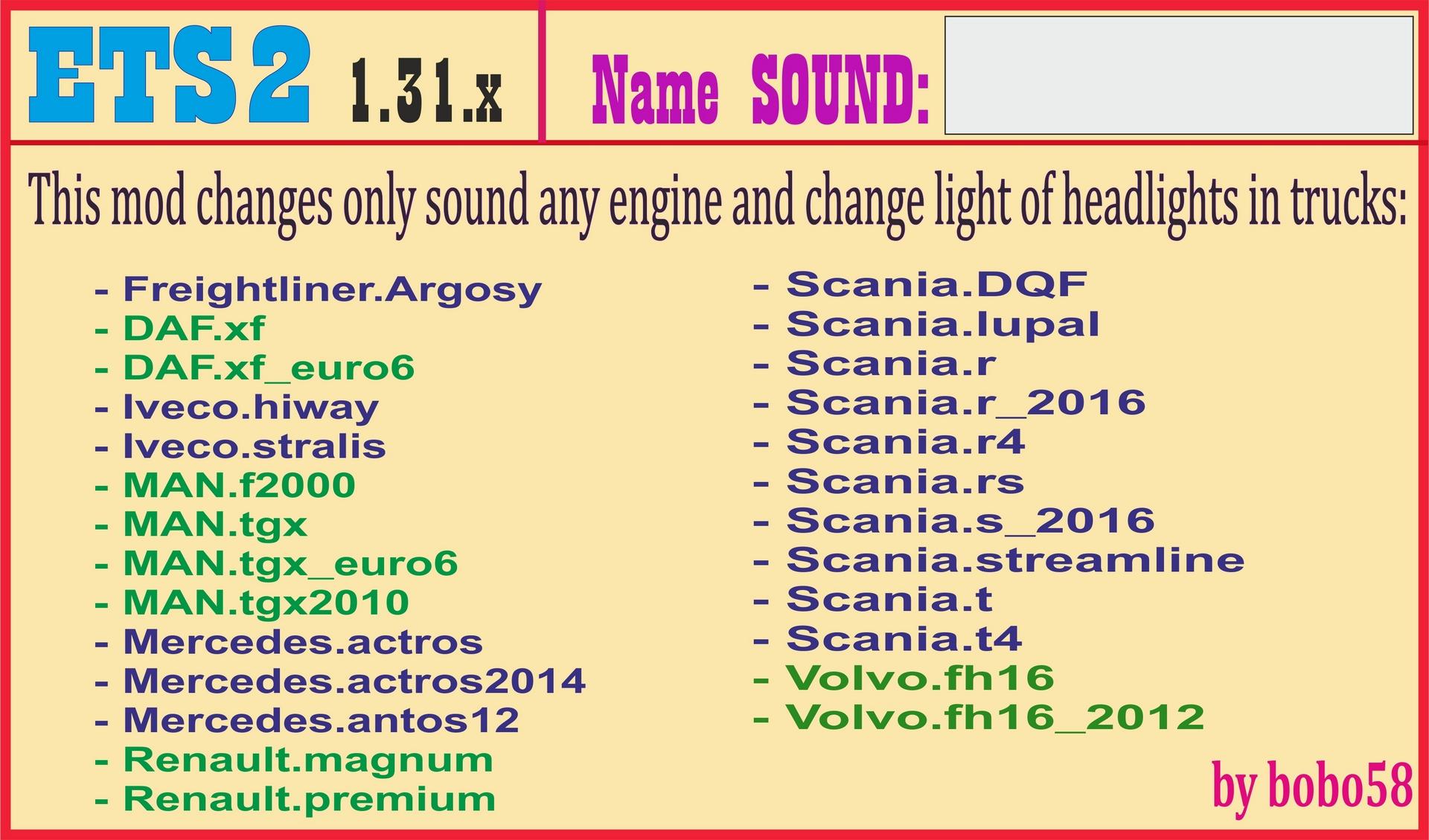 These mod replace the sound of any engine and light of headlight in trucks: