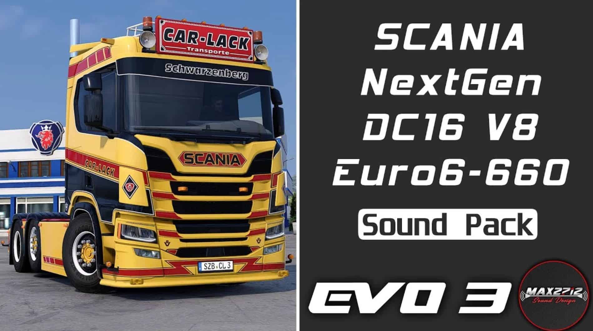 Sound pack for the Scania NextGen trucks for ETS2, made of studio-quality sound samples recorded on a 2022 Scania R660 V8 by Car-Lack GmbH, equipped with a stock 16.4l Scania DC16 122 V8 Euro 6 engine. All sounds of the R660 have been professionally recorded using studio audio equipment, such as the engine, all interior sounds, the air-brakes, the G33CM gearbox and much more!