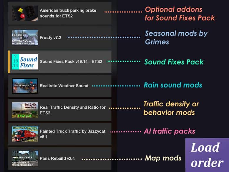 * Traffic density/behavior mods (in lower priority in Mod Manager) can enable the realistic sound ranges plugin from Sound Fixes Pack by inserting this line into def/traffic_data.sii: @include “traffic_data_update.sui”