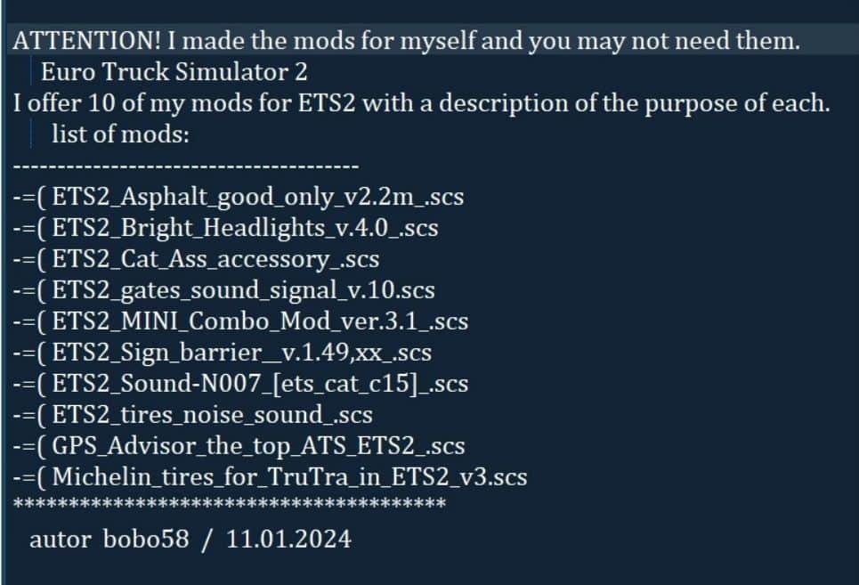 I offer 10 of my mods for ETS2 with a description of the purpose of each.