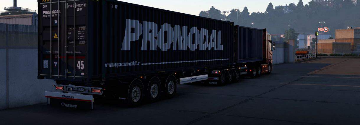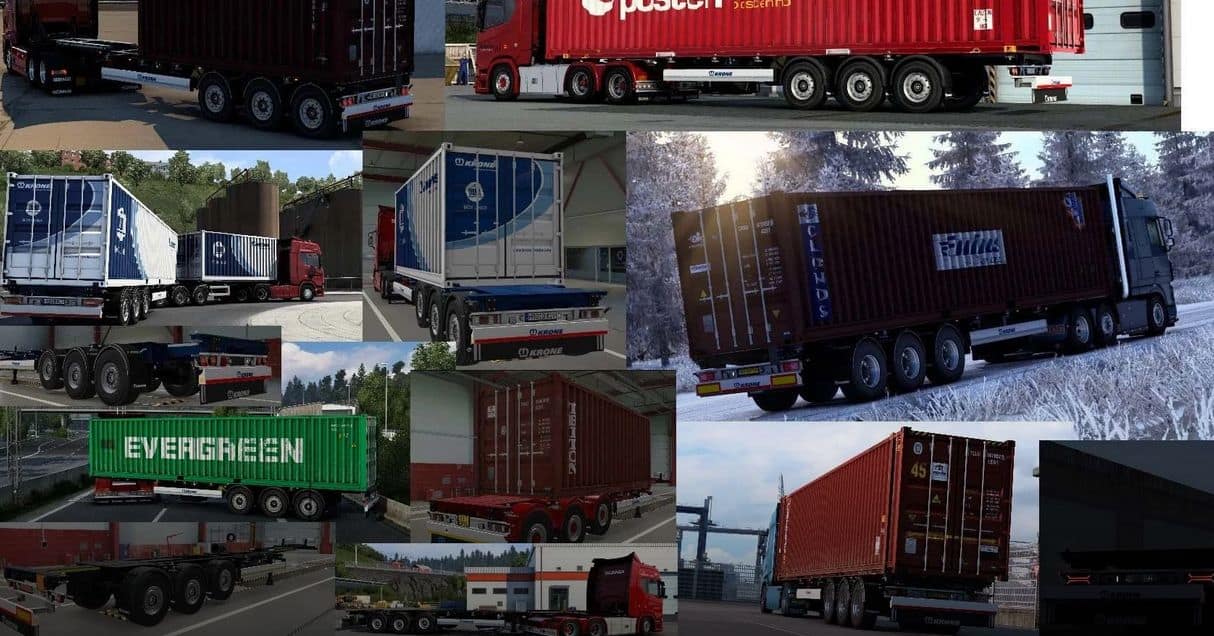 This mod adds a new 45ft chassis, a rear mounted option for 20ft containers, ownable containers (use the trailer as a standard dryvan or reefer trailer), dolly options (Tyllis, VAK and Närko by Kast) and a B-Double (VAK V-Slider by Kast), and plenty of customisation!