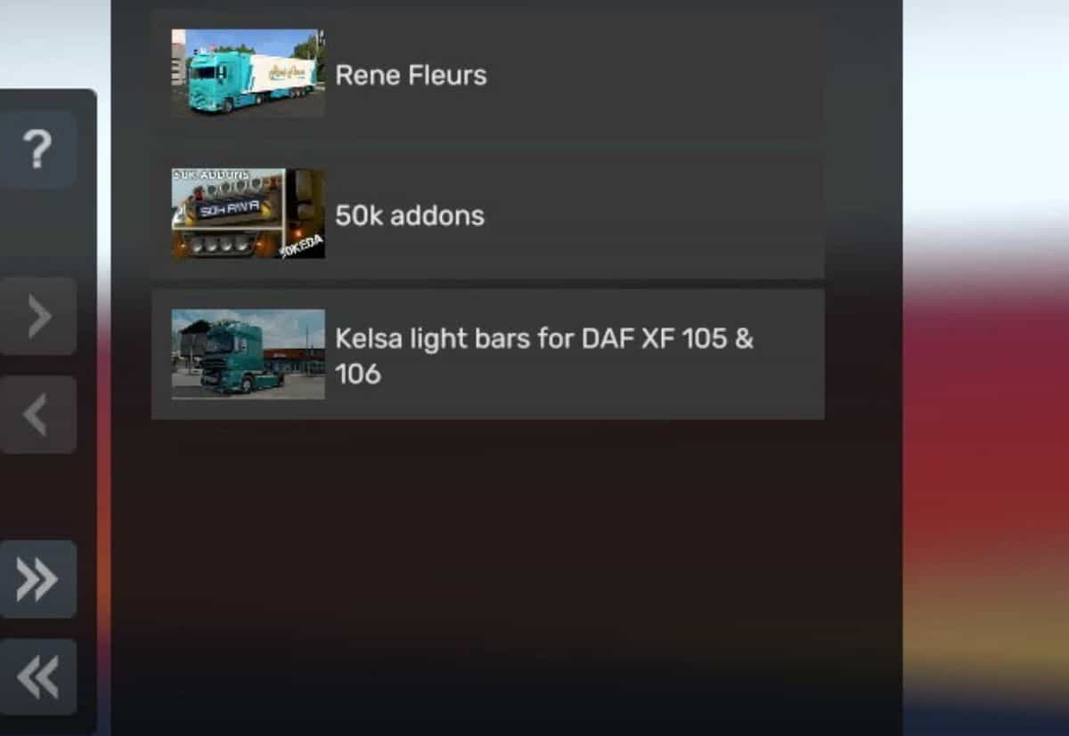 Combo Skin Rene Fleurs v1.0 ETS2 Mods | 7 Sep, 2024 Combo Skin Rene Fleurs v1.0 Trucks supported: – DAF XF Trailers supported: – Krone Cool Liner need to install mods Legendary “50k-addons” Kelsa Lightbars for DAF XF 105 & 106 Credits: Alik This content was uploaded by website visitors. If you notice any mistake, please let us know. Download Tags: Krone Cool Liner You may also like... MAN TGX E6 by Gloover Custom Skin v1.0 Truck Skins 13 Jun, 2025 SCANIA RJL White Blue Skin v1.0 Truck Skins 5 Mar, 2024 FREIGHTLINER INSPIRATION RACE TRUCK SKIN 1.27 Truck Skins 6 May, 2017 Leave a Reply Cancel reply Your email address will not be published. Required fields are marked *Comment Name * Email * I have read and accepted the Privacy Policy * CategoriesETS2 Bus ETS2 Cars ETS2 Interiors ETS2 Map Objects ETS2 Maps ETS2 Other ETS2 Packs ETS2 Parts / Tuning ETS2 Sounds ETS2 Traffic ETS2 Trailer Skins ETS2 Trailers ETS2 Truck Skins ETS2 Trucks ETS2 Vehicles ETS2 Weather