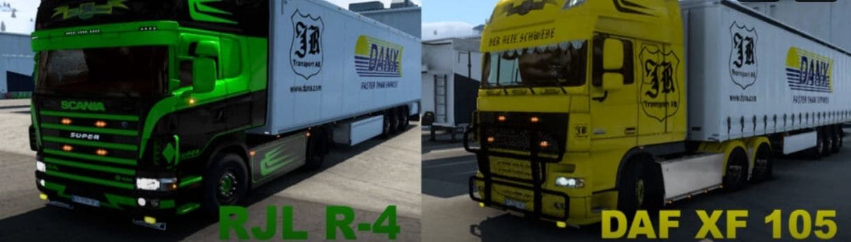 Jimmy Rosenqvist Transport Skin Pack v1.0 ETS2 Mods | 3 Dec, 2023 Jimmy Rosenqvist Transport Skin Pack v1.0 Skins for: 1.Scania RJL R&S (2 skins, Topline cab) 2.Scania RJL R-4 (Topline cab) 3.DAF XF 105 (SuperSpace cab) + “DANX” company skins for all SCS trailers Credits: Rocker Trucker This content was uploaded by website visitors. If you notice any mistake, please let us know. Download Tags: SCS You may also like... IRIZAR I6 – SKIN SAAD VOYAGE – ETS2 1.34 & 1.35 MOD Truck Skins 17 Jun, 2019 Euro Frigo Truck Skin for Scania RJL Truck Skins 28 Mar, 2017 COLORED METALIC PLANE TRUCK SKIN FOR RJL Truck Skins 21 Aug, 2017 Leave a Reply Cancel reply Your email address will not be published. Required fields are marked *Comment Name * Email * I have read and accepted the Privacy Policy * CategoriesETS2 Bus ETS2 Cars ETS2 Interiors ETS2 Map Objects ETS2 Maps ETS2 Other ETS2 Packs ETS2 Parts / Tuning ETS2 Sounds ETS2 Traffic ETS2 Trailer Skins ETS2 Trailers ETS2 Truck Skins ETS2 Trucks ETS2 Vehicles ETS2 Weather