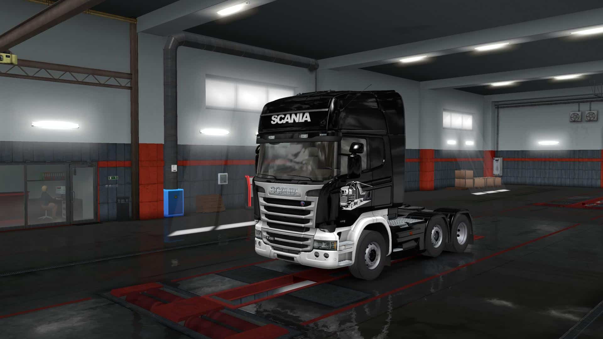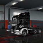 A Black & White skin with a white lightning on the back and old Scania truck illustrations on the doors.